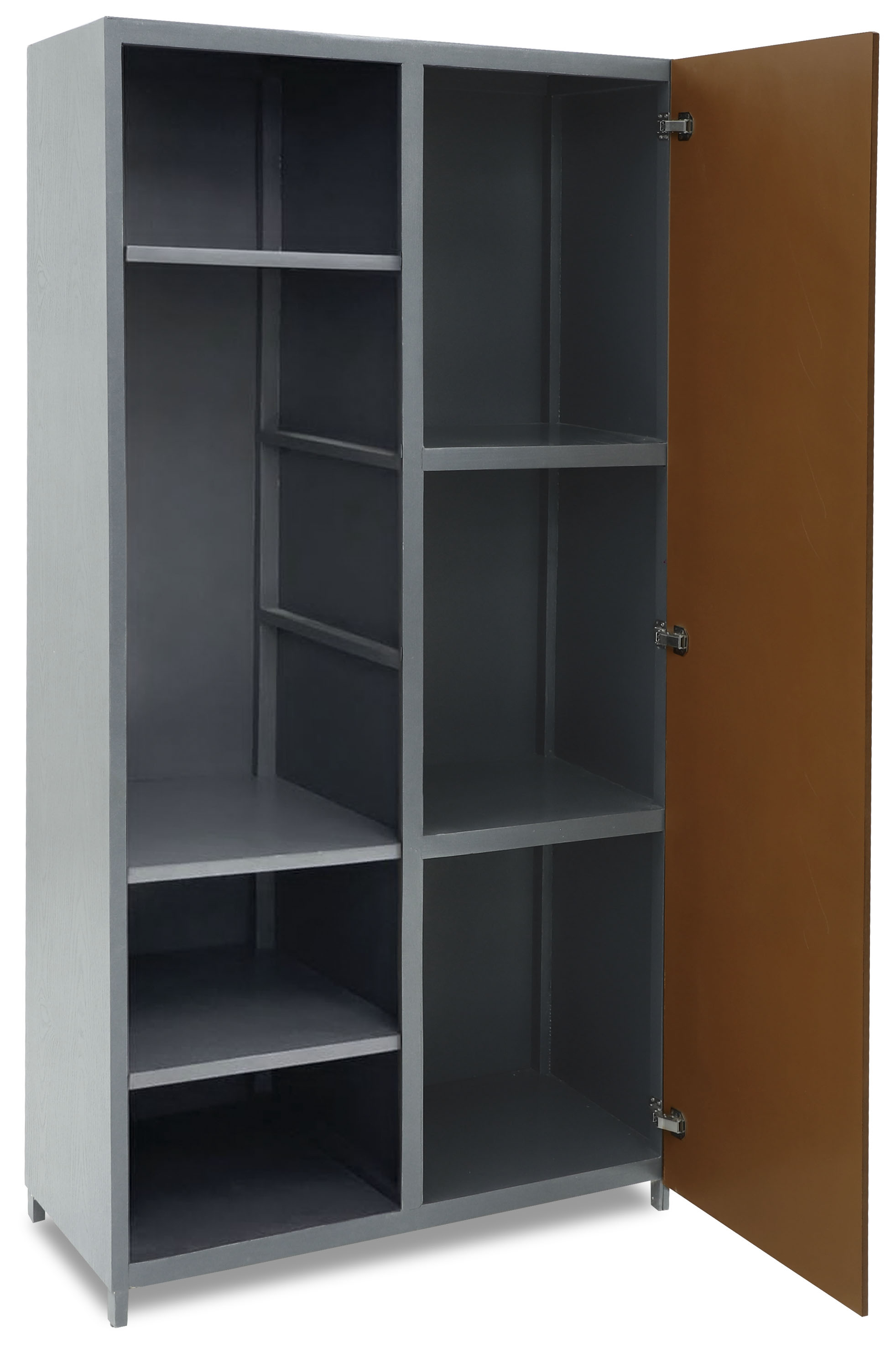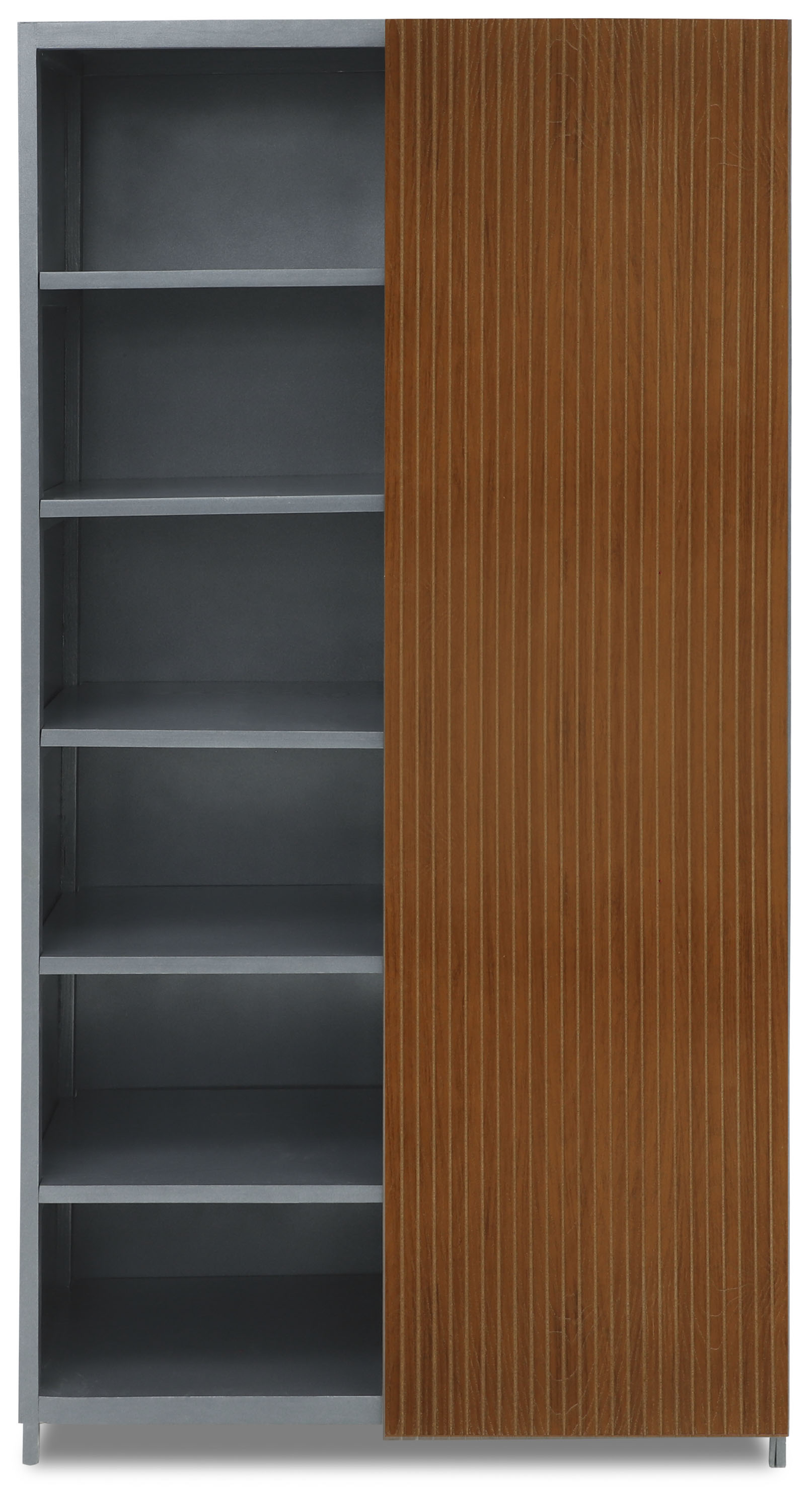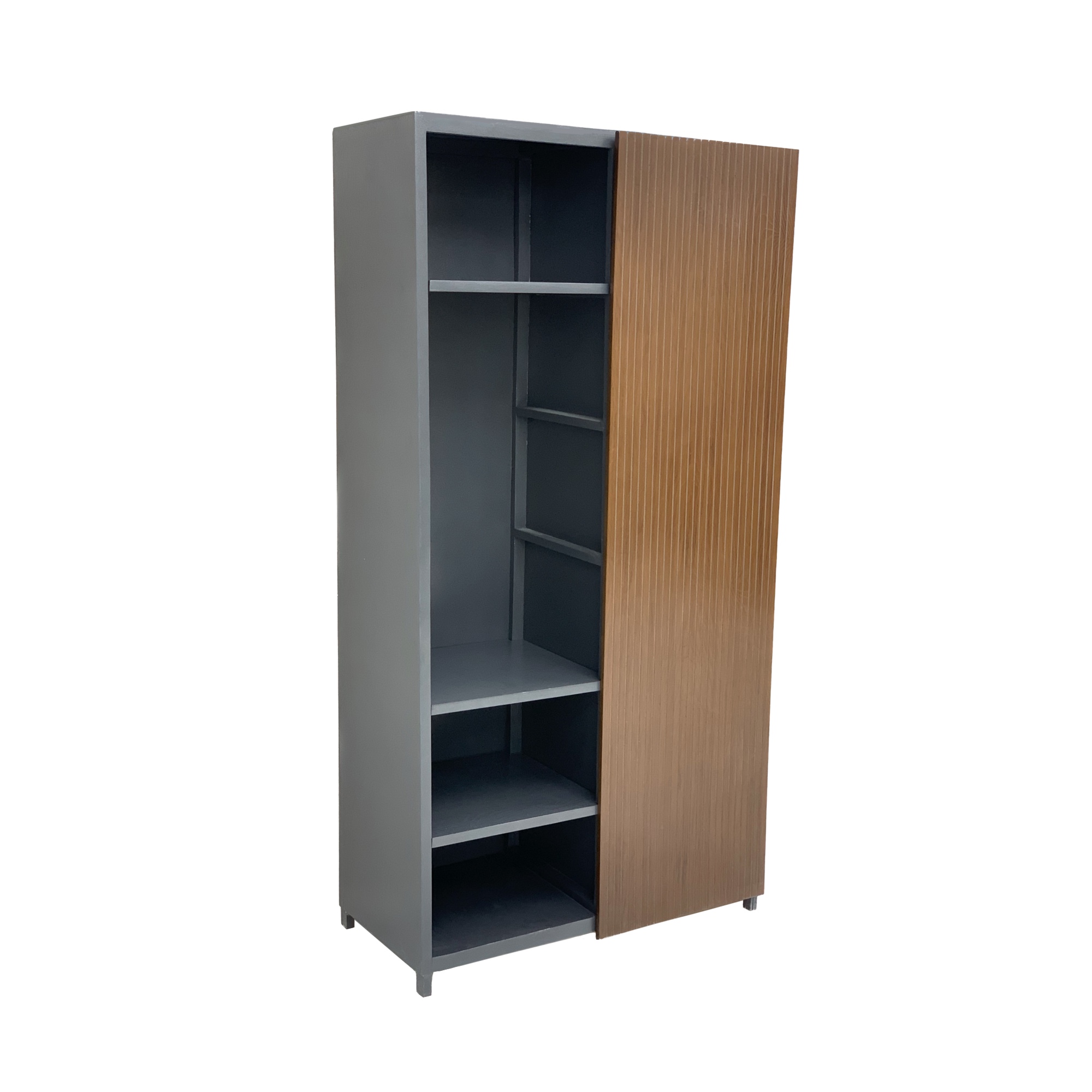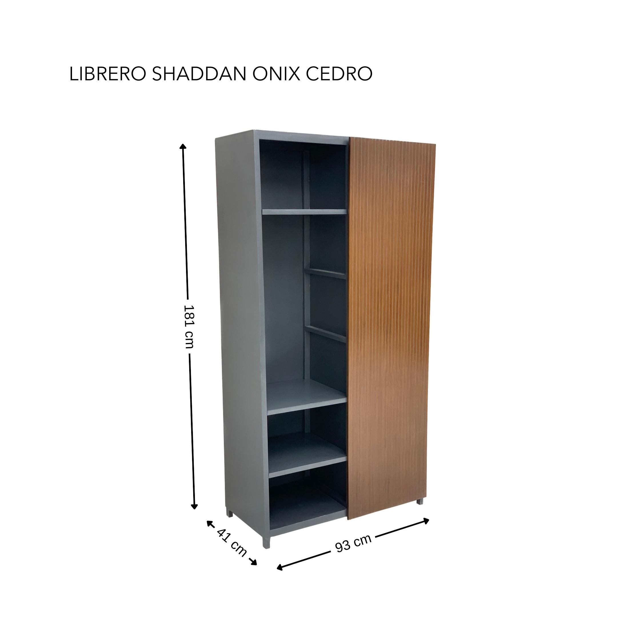 Librero SHADDAN color onix, puerta color cedro con rayado decorativo. Entrepaños removibles para mayor espacio.