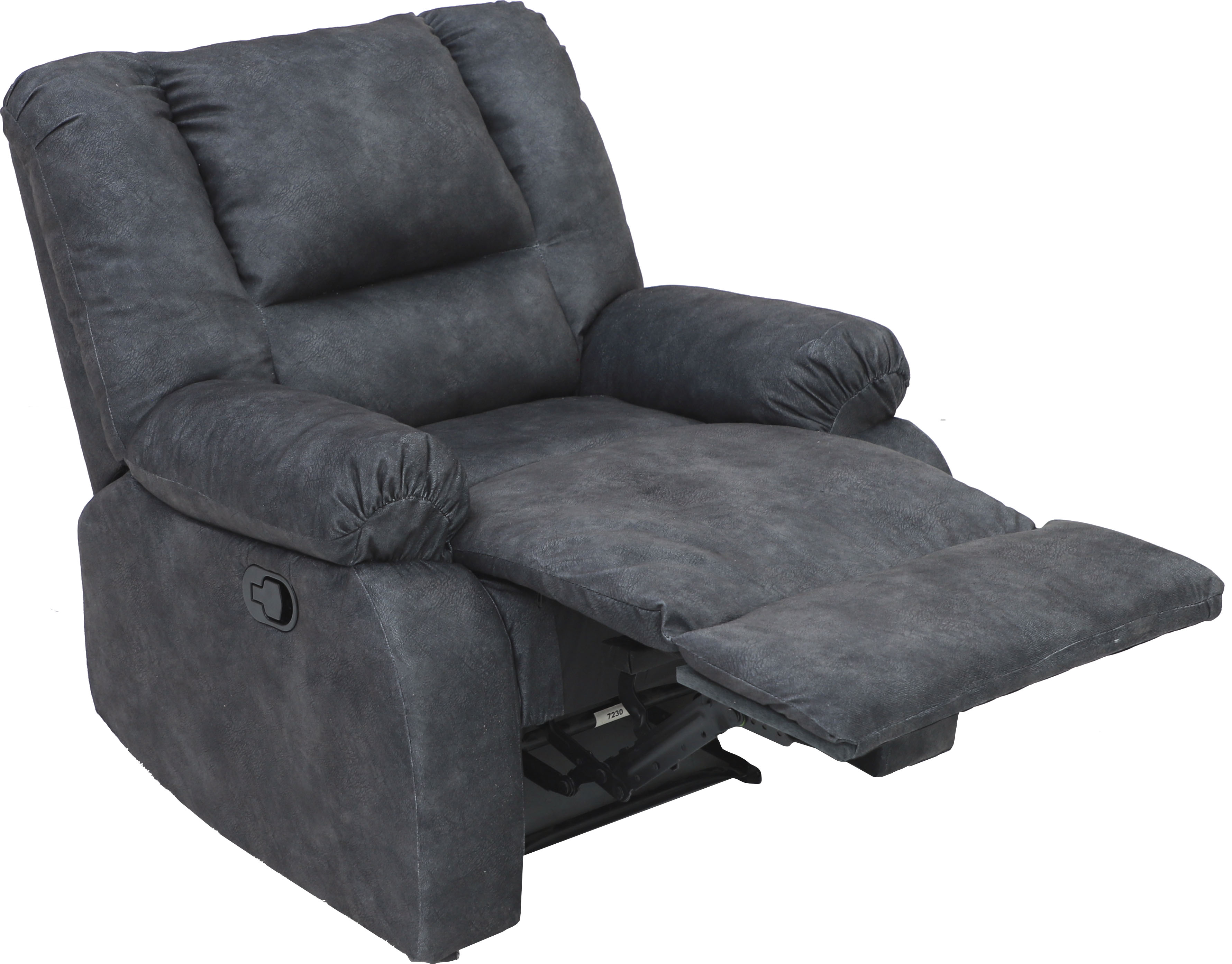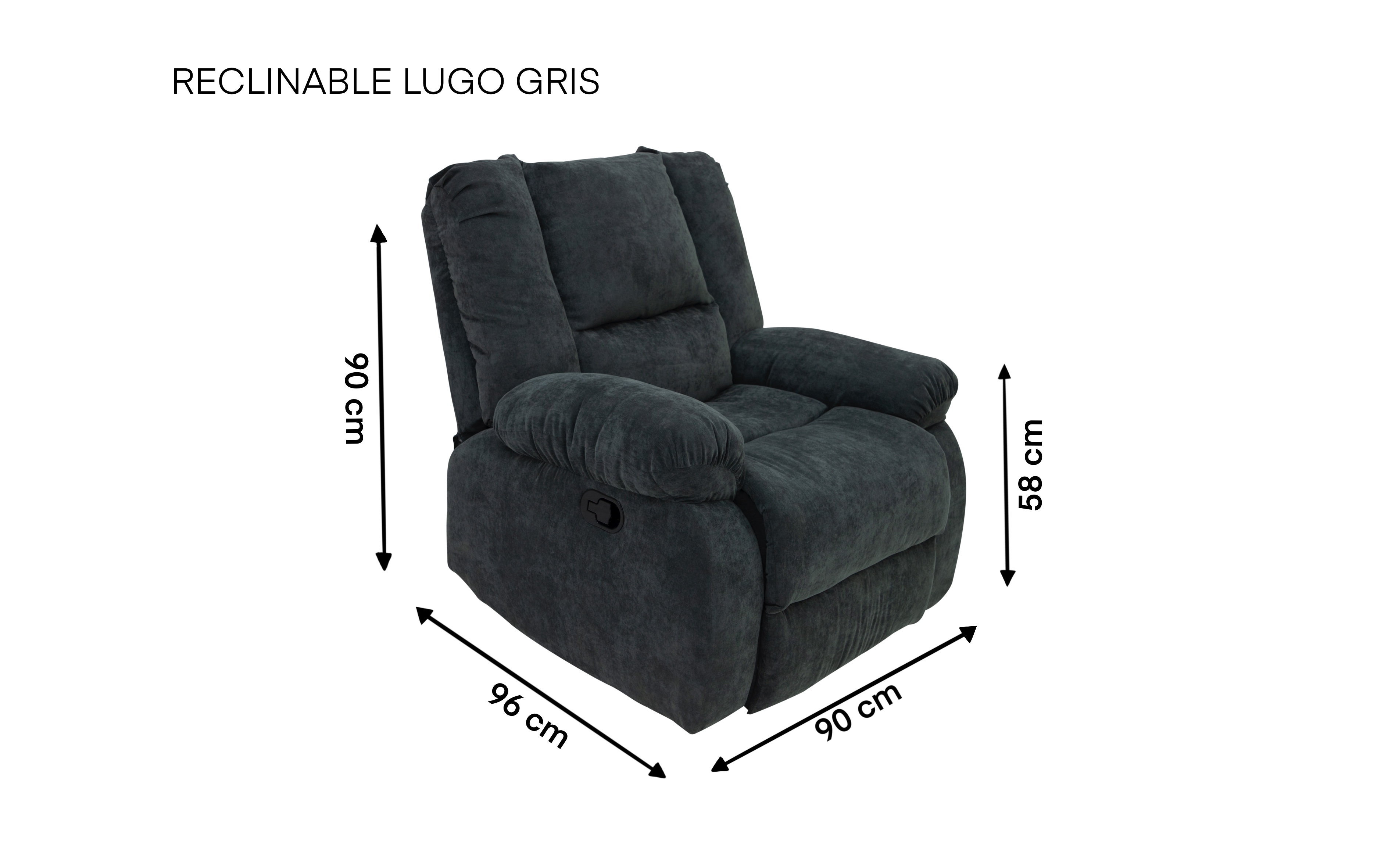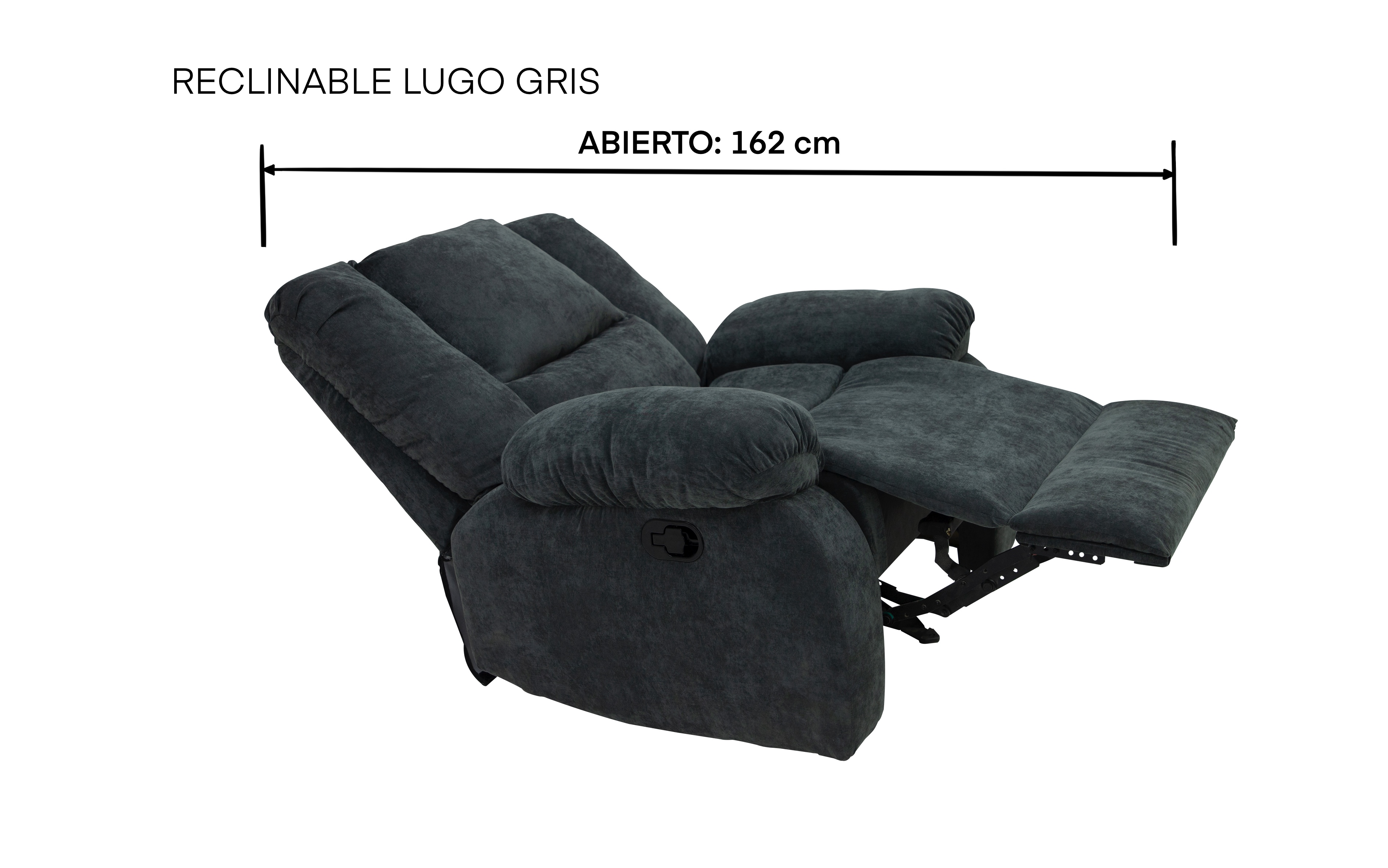 Reclinable LUGO, tapizado en tela velvet color GRIS. Mecanismo de inclinación y mecedora, no es giratorio. Reclinable abierto: 162 cm.